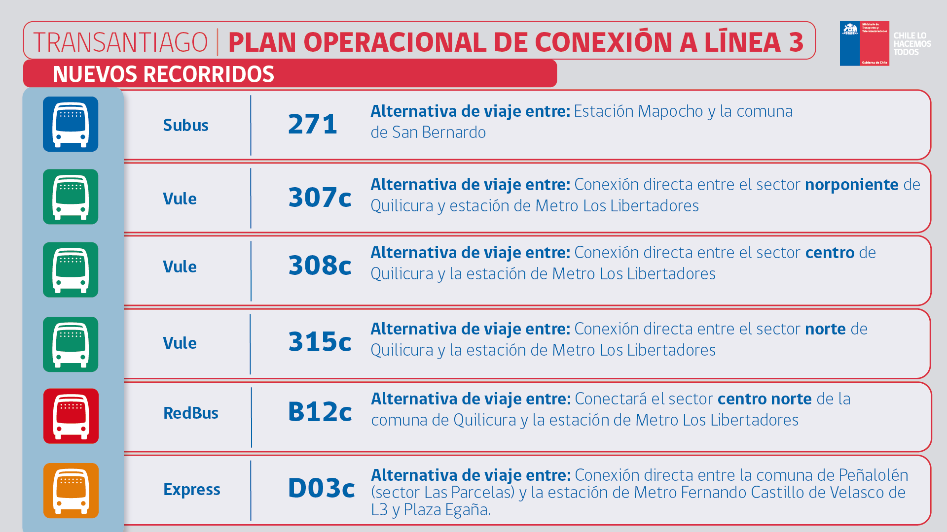Para facilitar el traslado de pasajeros, especialmente de Quilicura a las nuevas estaciones, se dará inicio a 5 nuevos recorridos que unirá el norte, norponiente y centro de Quilicura con la nueva estación Los Libertadores.