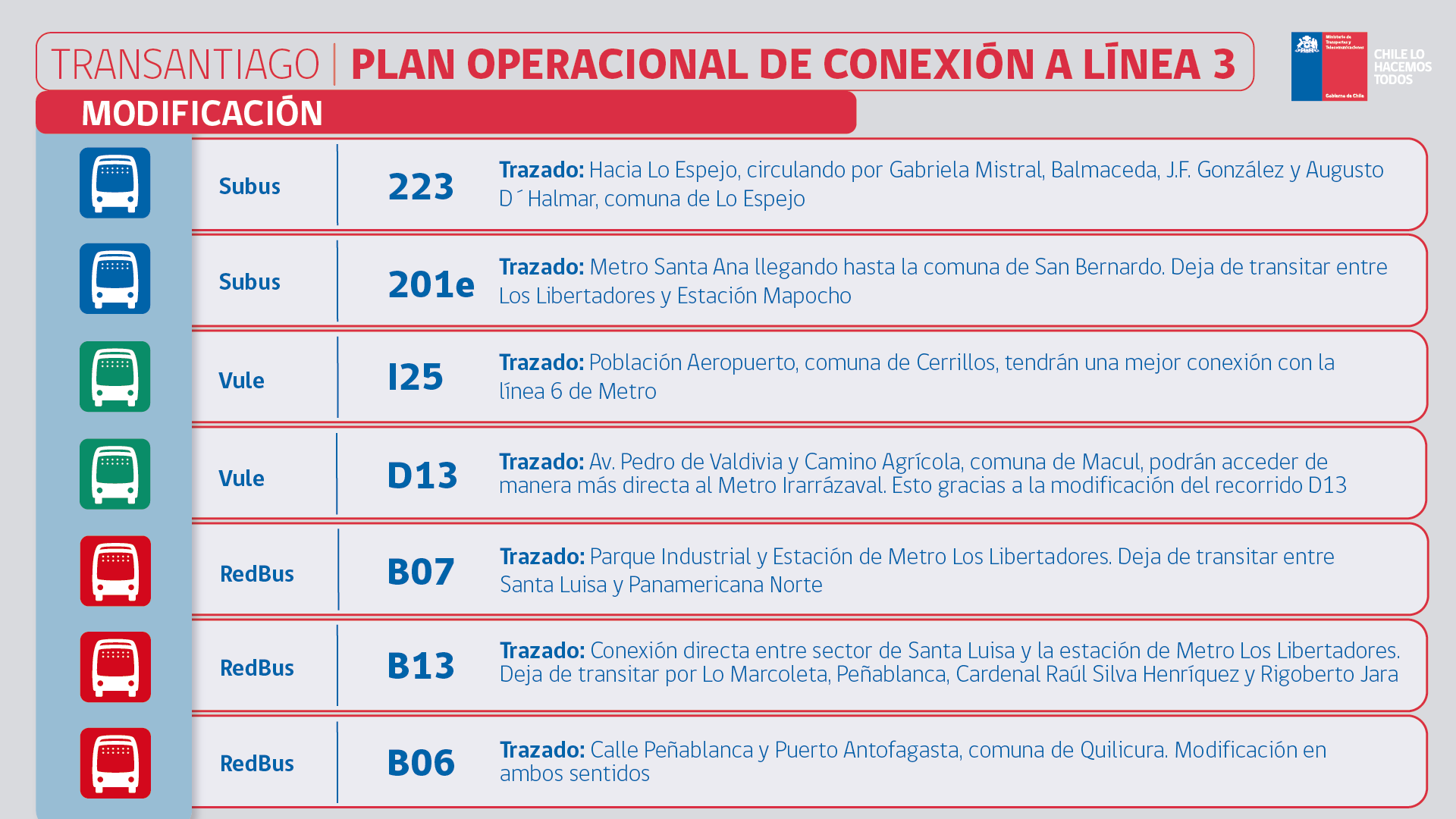 Además, el DTPM con el fin de alimentar la nueva red y mejorar la eficiencia del transporte en superficie, modificará otros 7 recorridos y optimizará otros 3, los que serán reemplazados por otros de mayor cobertura.